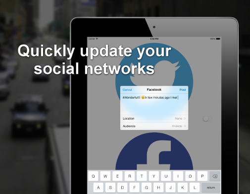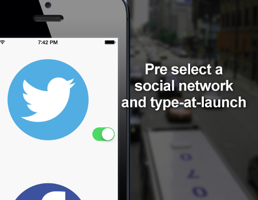 Support for Facebook and Twitter. Integration with iOS system accounts. Pre-select your preferred social network so you can instantly start typing as soon as the app is running.